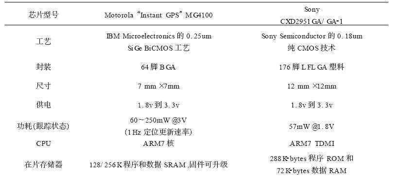 表2 Motorola“Instant GPS”MG4100 与Sony CXD2951GA/GA-1 芯片的比较