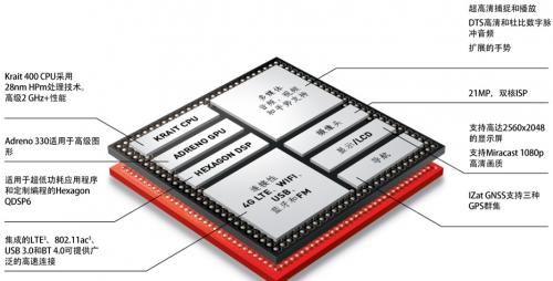 骁龙800系列处理器配备四核Krait 400 CPU,在骁龙S4 Pro处理器的基础上,性能提升最高达75%,并将制程技术进一步提升到28纳米HPm(High Performance for mobile,高性能移动计算)技术节点,功耗更低。Krait是异步对称多处理(aSMP)架构,提供每核峰值性能的动态功率感知和控制,无需使用其它专用核心即可延长电池续航时间。全新四核Krait 400 CPU每核心速度最高达2.3GHz,提供同类最佳的每瓦性能,使处理器性能满足高级移动终端更高的处理和通信要求。此外,骁龙800还集成了800MHz的2x32bit LP-DDR3内存,采用业界领先的12.8GBps内存带宽。