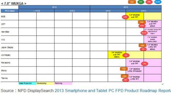 NPD DisplaySearch 指出, 以7寸产品为例,主流面板供货商多有WUXGA规格在计划在下半年开出。其中BOE (京东方)、CPT (华映)、IVO (龙腾)、LG Display、Panasonic基于原有a-Si (非晶硅) TFT产品进行升级, JDI、Tianma(天马)则计划采用LTPS(低温多晶硅)技术,而Hannstar经过评估后则采取了Oxide(金属氧化物)技术路线。此外,Sharp将会推出基于LTPS或Oxide的WUXGA产品。由于产品参数已达325ppi,技术难度较高,将会考验各面板厂商的技术能力及稳定量产能力。