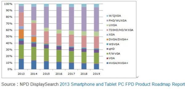 导读:NPD DisplaySearch最新发表的2013年智能手机与智能平板面板蓝图报告显示,面板厂商积极应对大尺寸市场需求,下半年5寸及以上手机面板产品规格更加丰富,产品数量呈现快速增长态势。FHD WUXGA分辨率渗透率将由2013年的9.7%快速提升至2016年40.7%。