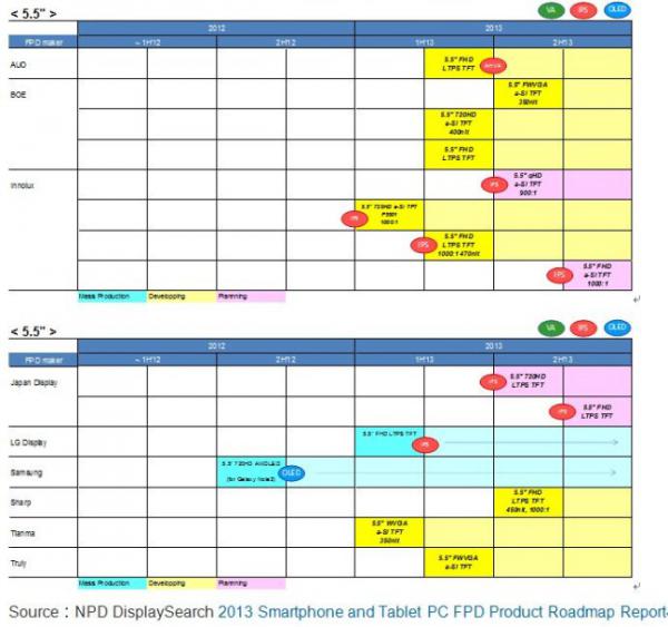 NPD DisplaySearch 指出, 以5.5寸产品为例,三星Galaxy Note II系列采用5.5寸1280×720分辨率AMOLED面板并于消费者市场获得认可。而LG和联想则分别于Optimus G和K900系列采用了1920×1080 LTPS TFT显示面板。未来5.5寸高阶手机产品将继续保持720HD及FHD的产品规格,而主流面板厂商下半年亦多有产品布局,其中AUO (友达) 、BOE(京东方)、Innolux(群创)、LG Display、Sharp和JDI皆有FHD LTPS产品开出,而除三星继续生产720HD AMOLED产品外,BOE(京东方)和Innolux (群创)将会开出720HD a-Si (非晶硅)TFT产品,而JDI亦有基于LTPS(低温多晶硅)的720HD产品规划。