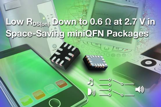 Vishay Intertechnology, Inc.(NYSE 股市代号:VSH)宣布,推出3款新型单极双掷(SPDT)和双路的双极双掷(DPDT)CMOS低压模拟开关--- DG2735A、DG2725和DG2599。这些器件具有低工作电压和低导通电阻,采用小尺寸miniQFN封装,可在空间受限的便携式终端产品中用于音频、SIM卡和多功能信号切换。