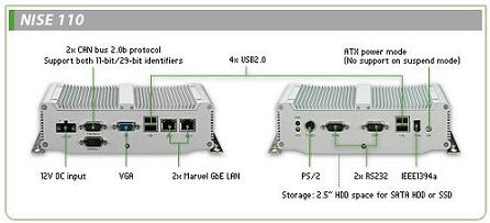 NISE 110无风扇PC拥有2x CAN Bus 2.0b和2x RS232接口, 超小尺寸仅手掌大小的无风扇机箱, 尺寸为185(W)×131(D)×54mm(H)。紧凑尺寸的设计使NISE 110无风扇PC 成为空间限制环境应用及嵌入工业自动化设备应用的最佳解决方案。基于Intel Tolapai EP80579高集成处理器,NISE 110无风扇PC提供的2个CAN bus(2.0b protocol)接口作为实时控制应用,可以同时支持11bit和29bit标识符,速率可达1Mbps(40MHz时钟频率)。