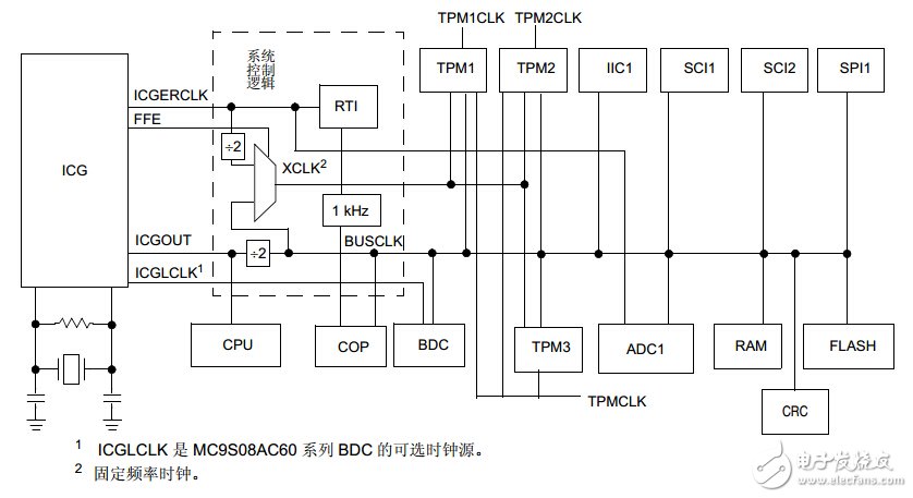 复位后,MCU使用内部生成的时钟(自时钟模式— fSelf_reset),相当于8 MHz 晶体振荡频率。这个频率的时钟源在复位启动时使用,可以作为停止恢复的时钟源,这样可以避免较长的晶体启动延迟。该MCU还包含一个可修整的内部时钟发生器(ICG) 模块,可以用它来运行MCU。