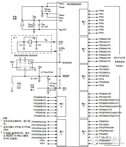 RESET 是一个专用的引脚,内置一个上拉器件。它有输入滞后,包含一个高电流输出驱动,无输出斜率控制。内部加电复位和低压复压电路一般都不需要外部复位电路。 这个引脚通常连接到标准的6引脚后台调试连接器,这样开发系统可以直接复位MCU系统。