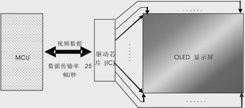 芯片技术的进一步发展使高数据传输率和真彩色得以实现。因此,用于PMP的OLED显示屏已经投放市场,而用于手机的OLED视频显示屏也将问世。为了更好地发挥用于PMP和手机的OLED显示器的先天优势,一块高性能的驱动芯片十分必要。无论播放还是拍摄视频,都需要在每一帧图像之间进行流畅的过渡。OLED以其高速反应时间而闻名;然而,为了持续向OLED屏幕提供数据,MCU (微处理器) 和OLED驱动芯片之间必须有足够高的数据传输率 (见图2)。首先,驱动芯片必须具备一个高速的MCU接口。其次,为了显示实际的视频或图像,处理复杂色深度(即色彩数)的能力也是不可缺少的。