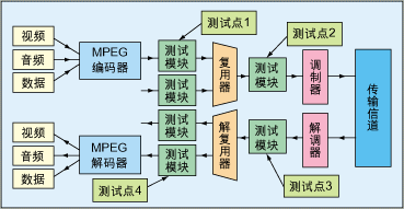 码流分析仪可用作数字电视设备的调试工具,如检测MPEG编码器、复用器、调制解调器等设备的输入输出码流是否符合MPEG-2/数字电视广播(DVB)标准等。作为标准检验设备,码流分析仪是整个数字电视系统的不可缺少的重要设备。实际使用中的数字电视集成系统是一项庞大、复杂的系统工程,从前端到后端,无论哪个环节出了差错,都将导致整个系统的瘫痪,为了迅速有效地找出故障源,需要在各测试点使用码流分析仪。如图1所示,可以在测试点1-4插入码流分析仪,组成对传输(TS)码流互联层的监控、测试和报警。