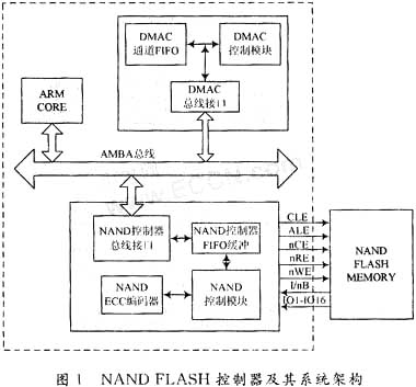 本文所讨论的NAND FLASH控制器是针对一款基于ARM7TDMI的SoC芯片,该控制器在芯片中的位置如图1所示,作为AMBA总线上的一个从设备集成于AHB上。主要模块包括总线接口模块、FIFO缓冲模块、ECC编码模块以及逻辑控制模块。