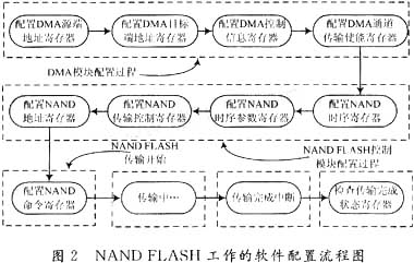 按照上节对控制器结构以及传输机理的分析,NANDFLASH的使用需要在FLASH控制器模块以及DMA控制器模块的协同下完成,工作的软件流程如图2所示。