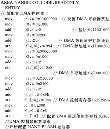 系统上电前,外部硬线NAND BOOT开关选择从NAND FLASH启动。芯片设计时,默认DMA占有系统总线,DMA按照配置寄存器的默认值工作,其源地址指向NAND FLASH,目标地址指向片上SRAM,NANDFLASH控制器在NAND BOOT选中的情况下,默认向NAND FLASH的首页发出读命令。即上电后,DMA控制器以及NAND FLASH控制器默认的把FLASH存储器中的第一页搬到了片上SRAM中。一直到DMA的工作完成前,ARM核无法占用总线。此时零地址映射在片上SRAM,DMA完成搬运后,ARM开始执行程序。此段代码完成的工作包括对SDRAM控制器的初始化,从NAND FLASH搬运核心代码至SDRAM,配置地址重映射寄存器至零地址处,最后将PC指向零地址的SDRAM。在SDRAM执行的代码开始真正启动系统。