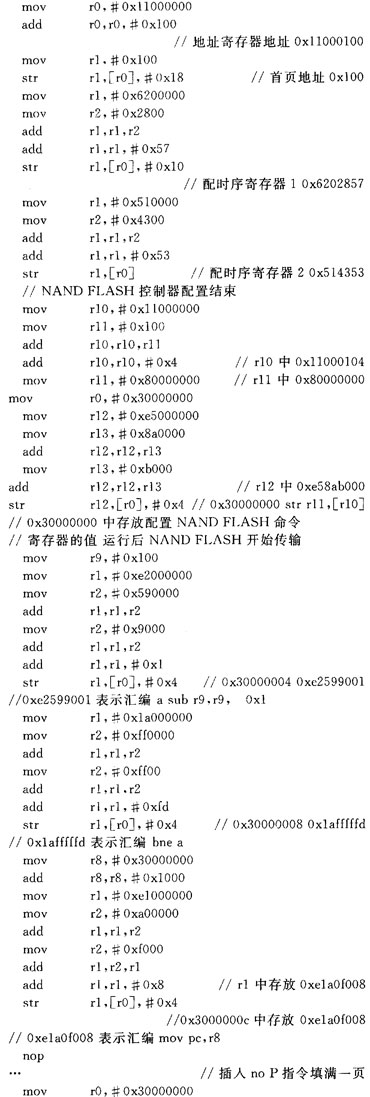 目前支持从NAND FLASH启动的SoC芯片中,一般都内嵌有片卜存储器。各个处理器厂商对这块片上存储器定义的容量大小有所不同,但是启动模式都是比较一致的。NAND FLASH按页顺序读取的方式,意味着对当前的存储地址访问后就无法马上再次访问,需在当前页访问完成后,重新对此页访问时,才可对先前的地址单元再次访问,这就导致了一些程序语句无法执行,譬如跳转、循环等语句的使用。因此NAND FLASH仅作为启动代码的存储区,而真正执行的存储器区域是内嵌的片上存储器或者片外的SDRAM。