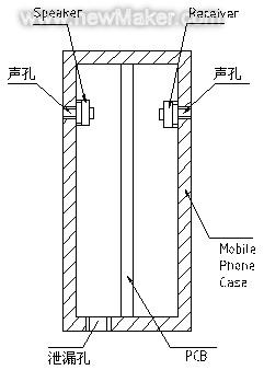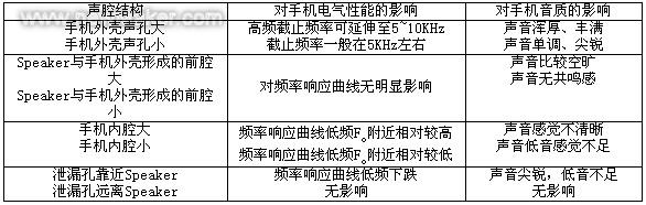 主要指手机内部所构成的声腔或者泄漏孔对Speaker的性能或者声音产生的影响,如下图所示,声孔、前腔、内腔、泄漏孔等等都会对手机的整机音质表现产生影响,首先要用Rubber Ring,即环形橡胶垫把Speaker与手机外壳密封起来,使声音不会漏到手机内腔,然后就是声孔、前腔、内腔的合理配合。
