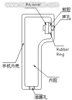 主要指手机内部所构成的声腔或者泄漏孔对Receiver的性能或者声音产生的影响,如下图所示,声孔、前腔、内腔、泄漏孔等等都会对手机的整机音质表现产生影响,首先要用Rubber Ring,即环形橡胶垫把Receiver与手机外壳密封起来,使声音不会漏到手机内腔,然后就是声孔、前腔、内腔的合理配合。