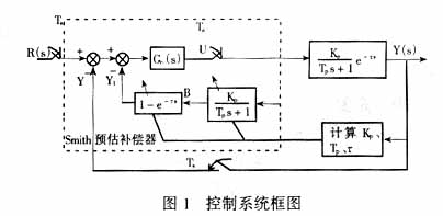Smith预估补偿控制自发明以来,最初由于受硬件条件的限制,很少在实际中被应用,近几年来,由于计算机技术的发展,Smith预估补偿控制在实际中应用越来越多。但由于其控制算法本身存在着控制效果紧紧依赖模型精度的缺点,而实际中由于各种原因往往很难获得非常准确的数学模型,所以实际应用中其控制效果并非那么理想。模型误差,尤其是纯滞后时间的误差较大时有时会使控制系统不稳定[1],因此近几年来关于Smith预估补偿控制改进型控制方案的研究很盛行。结合现在流行的模型预测控制的基本思想,在被控对象的输入端加一阶跃输入信号,通过测量即可获得被控对象的非参数模型即阶跃响应曲线。再利用系统识别的方法即可获得较准确的被控对象的参数模型。根据所获得的被控对象的参数模型在线地修正Smith预估补偿器中的模型参数,使得Smith预估补偿器中的模型与实际被控对象的模型误差最小或为零,这样设计的改进型控制方案,无论从理论还是从实际来看,其控制效果都要优于传统的Smith预估补偿控制。