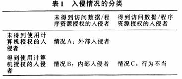一般来说,外部入侵者的首要工作是进入系统。所外人,也可能是合法用户,但违规使用了未经授权的资源。另一方面,除了拒绝服务攻击外,多数攻击都需要入侵者取得用户身份。Anderson更进一步把入侵情况按表1所示分类。
