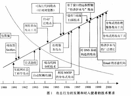 现在的攻击行为向着大规模、自动和协同方向发展。攻击已经变得越来越复杂、越来越自动化。图1中,实线代表攻击行为,虚线代表入侵者需要掌握的技术,他显示了从90年代起,攻击行为的发展和对入侵者技术要求降低的情况。CERT/CC曾预言:攻击行为的自动化可能在因特网上引发大规模的入侵活动,这在今天得到了验证。