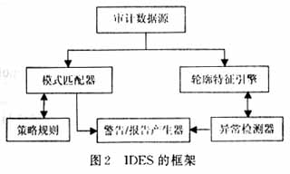 1988年,特里萨·兰特等人改进了顿宁的入侵检测模型,并开发出了一个IDES。该系统包括一个异常检测器和一个专家系统,分别用于异常模型的建立和基于规则的特征分析检测。系统的框架如图2所示。