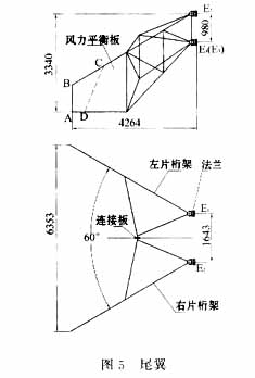 尾翼(图5)采用桁架结构,由钢管(外径×壁厚:95 mm×4 mm)、球形件、法兰及钢板焊接而成。它包含有左片桁架和右片桁架等零部件。其结构特点及设计原理如下: