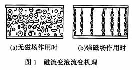 磁流变液由人工方法合成,集固体属性和流体流动性于一体,其流变特性,如粘度、塑性、弹性等会随外加磁场的改变而迅速变化。实验表明,在没有磁场作用时,粒子悬浮在母液中,在空间随机分布,如图1a所示,磁流变液符合牛顿流体的本构关系,具有较低的粘度。而施加磁场后,磁性微粒克服热运动作用而沿磁场方向结成链状结构,如图1b所示。一条极化链中各相邻粒子间的吸引力随外加磁场强度的增强而增大。当磁场增至临界值时,磁偶极子的相互作用超过热运动,则磁性微粒热运动受缚,此时磁流变液呈现固体特性。这一固-液两相转变的过程是可逆的,能够通过改变磁场而平稳、快速地完成,一般转换时间都为毫秒级。磁流变液的这种特性被称为磁流变效应(MRE)。