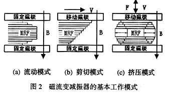 磁流变减振器是以磁流变体这种新型的智能材料作为减振器的工作液,并在减振器的活塞轴上缠绕电磁线圈,线圈产生的磁场作用于磁流变液,通过控制电磁线圈电流的大小来调整磁场强度进而改变磁流变液的粘度,实现阻尼可调的目的。根据磁流变液在减振器中的受力状态和流动形式的不同,磁流变减振器可分为流动模式(Flow Mode)、剪切模式(Shear Mode)、压缩模式(Squeeze Mode)以及这三种基本模式的任意组合。