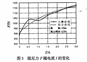 图5为减振器的阻尼力随电流的变化曲线。由图可看出,剪切阀式磁流变减振器的阻尼力随电流的增大明显增大,这也是磁流变优良特性的最直观体现。但这种增长趋势并非线性,随电流的进一步增大,阻尼力的增长幅度有所下降。可由图中虚线所示指数关系拟合。
