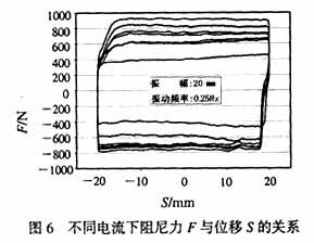 图6为减振器的阻尼力与位移的关系曲线,振动频率为0.25Hz,振幅为20mm,图中曲线由内到外对应减振器的电流分别为0,0.5,1,1.5,2,2.5,3A。由图可以看出,减振器的滞回曲线非常饱满,有较强的耗能减振特性,最大电流下减振器的最大阻尼力与最小电流下减振器的最小阻尼力之比定义为阻尼力的可调系数。由图知减振器的阻尼力可调系数随电流变化连续可调,阻尼力可调系数可达3左右。