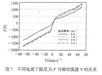 图7为减振器的阻尼力与相对流速的关系曲线,其振动频率为1Hz,电流分别为0、1、2、3A。由图可以看出,阻尼力随速度增大而增大,在速度正负区呈分段线性关系。这与(2)式是一致的。