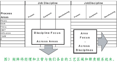 这个Fab的组织架构是一个工艺区域和职责纪律相交的矩阵,这是很多晶圆厂的典型情况。这个组织的实际情况是,其基础架构不能提供报告和数据总结,以便及时提醒fab中各个独立区域中负责各种纪律的经理们,以及负责特定区域的生产主管们。