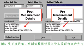 下一步是选择检测前后的测试。通过限定时限选择刚刚使用过的点检晶圆批, 系统会给出很少的备选数据提示,通常只有一个正确的待选数据。在后测试完成后,从这个列表中,通过如图6所示的图形用户界面,用户将正确的前、后数据关联起来。