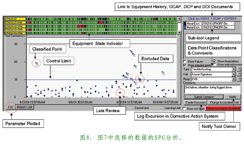 数据可以用SPC图的形式表示出来(如图8),还有一些额外的功能来支持缺陷控制工作。附加的图表注释功能包括: