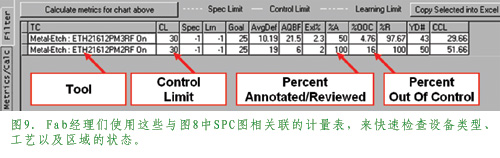 图9是表达图8中图表的一张计量表。这些表格按照设备类型,工艺,以及区域来积累而成,为fab经理提供一个总体的性能方面的统计结果。
