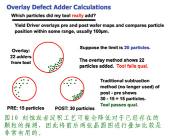 从经验上讲,增加的缺陷一直是按照检测后的缺陷减去检测前的缺陷计算得来。不幸的是,有时,这种方法会误检出干净的设备。这是一种特殊的情况,晶圆上增加或者减去薄膜,如果颗粒检测是按照BKM的方法,就要去匹配实际的工艺步骤。这种处理方法会降低对先前存在颗粒的探测,从而导致虚假的低缺陷计算。这种效应在Yield Driver操作者培训材料的一页中有解释(图10)。