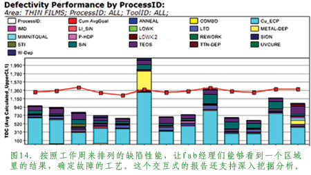 其他基于区域的网络报告,以缺陷性能的形式提交了Yield Driver的结果,按照工作周给出趋势图,按照设备来区分(图14)。这让经理对于整个区域的结果能够一目了然,确定哪些工艺更容易出故障。这个报告是交互式的,用户点击一下图表就能深入分析特定设备的详细数据。