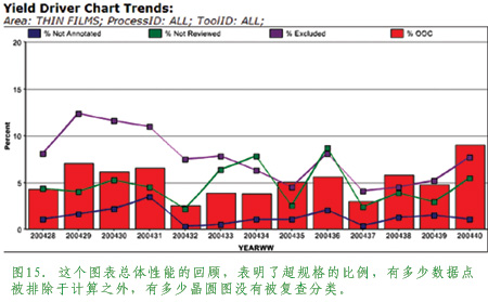 图15给出的报告是用来监控组织机构针对缺陷数据是如何利用和进行反映的。它给出out of control的比例(%OOC),没有评注的比例,以及没有复查的比例(两小时之内)。经理们使用这个报告来发现变化:有多少数据点被排除于计算之外,有多少晶圆图没有被复查分类。为了持续改进,%OOC应该保持在5%到10%。因为%OOC是使用的控制限的函数,零不良意味着规格太松, 而过多的不良则意味着规格太紧,导致工艺的频繁停机。