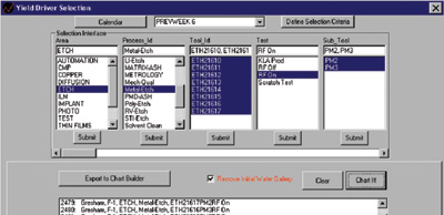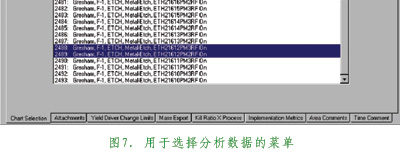从工艺区域开始数据选择,以便与fab组织机构相一致。主要的图表屏幕提供了交互式的深入分析功能,设计用来支持设备缺陷检测。每个层次缩小了数据的选择范围(如表所示)。一旦需要的数据被选中(如图7),它能够用图表列出需要的任意时段。
