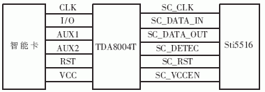 本文主要讨论智能卡与机顶盒之间的通信。机顶盒中的主芯片一般都提供与智能卡通信的接口,利用相应的硬件和通信协议,就可以实现它们之间的正常通信。在本文中,机顶盒芯片采用ST公司的Sti5516。由于Sti5516提供的智能卡接口需要外接一个接口芯片才能与智能卡通信,所以还采用了Philips公司的TDA8004T芯片。整个硬件框图如图1 所示。