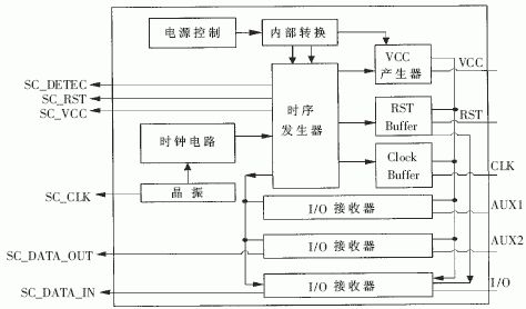 TDA8004T提供了一个低成本的异步智能卡接口,可用于电子付费、读卡器、付费电视等。它可以取代智能卡与微控制器之间的一些外部元器件,提供微控制器与智能卡之间稳定、低噪音并符合ISO-7816 标准的通信接口[1]。其原理结构图如图2所示。