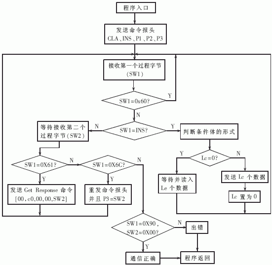 这样,在一个5字节命令报头传输后,接口设备等待一个或者两个过程字节。过程字节的值将指明接口设备请求的动作。如果过程字节的值与INS字节相同,表示接口设备向卡发送或者从卡接收所有数据;如果与INS字节的补码相同,表示接口设备向卡发送或者从卡接收下一个字节;如果为0x60,表示延长等待时间;如果为0x61,表示接口设备等待第二个过程字节,并根据第二个过程字节发送命令取回数据;如果为0x6c,表示接口设备等待第二个过程字节,并根据第二个过程字节重发上一条命令。如果过程字节是0x90、0x00,表示通信成功完成[2~3]。