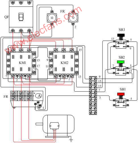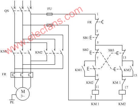 四、电动机正向(或反向)启动运转后,不必先按停止按钮使电动机停止,可以直接按反向(或正向)启动按钮,使电动机变为反方向运行。