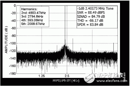 图2. AD7626输出,64,000点,FFT坐标图,-1 dBFS幅度,2.40173 MHz的输入信号音,10.000 MSPS采样率