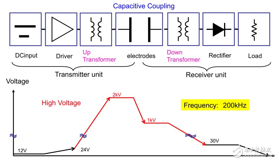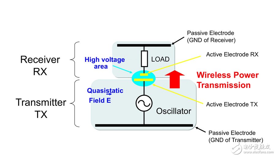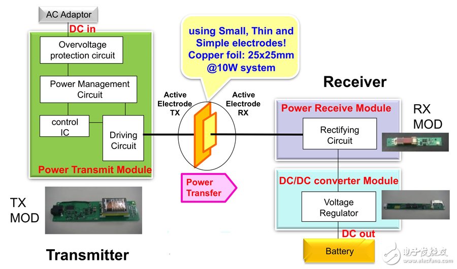 使用两组电极或极板就可以通过静电感应实现能量的传输。充电器或“发送器”和便携式设备或“接收器”用来有效地在组成电容的合适尺寸金属表面间实现纵向的准静电耦合。其中驱动电极或主动电极要比另外一个电极小,上面施加的电压较高,另外一个电极则是被动电极,尺寸较长,上面的电压较低。当然正常情况下,电容传输的能量是很小的,这与电极面积小有很大的关系。因此,为了满足给消费设备充电所需的功率水平(例如从5W至25W),需要增加电极尺寸和耦合的电压值,具体取决于实际的配置。