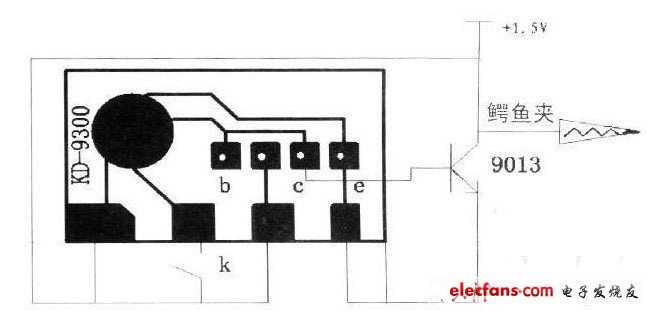 音频信号发生器,外围元件少,只有一只三极管和一只开关,焊接时可将三极营直接焊在音乐芯片预留的孔上,然后从三极管集电极引出一根线路,用来连接鳄鱼夹,电源采用一节7号电池,平时电路电流极小,因而未设电源开关。当按下开关K时,电路被触发,三极管集电极便产生一个音频信号,通过鳄鱼夹输出。
