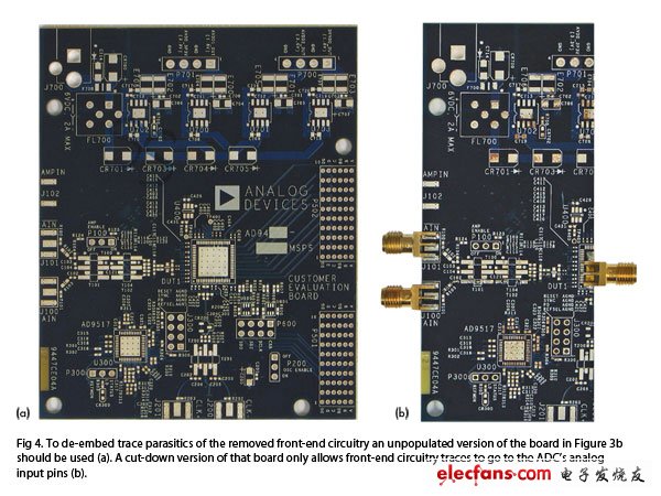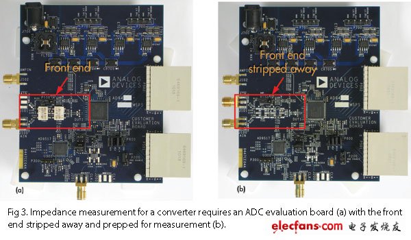 图3: ADC的阻抗测量需要一块ADC评估板(a)且要将(a)中的前端去掉以用于测量(b)。