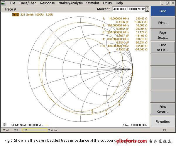 下一步是对剪切后的小裸板(图4b所示的第二块板)实施“通过”测量,以测量S21(图5)。这个文件(应以touchstone格式或?.S2P文件形式保存)将成为去嵌入文件,用以从焊有器件的板中剔除所有走线寄生效应。