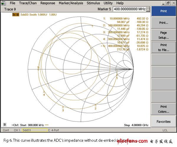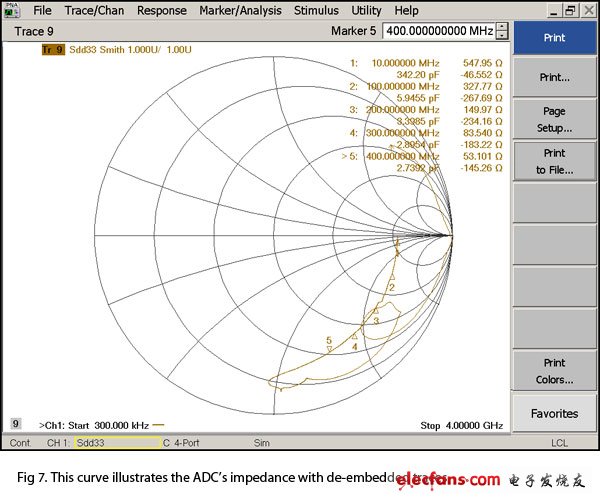 图7: 这条曲线说明了去掉前端电路寄生效应的ADC的阻抗。