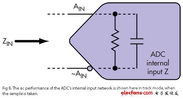 现在我们通过数学方法分析一下,看花在实验室测量上的时间是否值得。可对任何转换器的内部输入阻抗实施建模(图8)。该网络是表述跟踪模式下(即采样时)输入网络交流性能的一个良好模型。