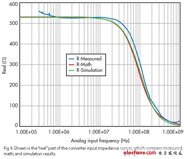 图9: 显示的是转换器输入阻抗曲线的“实部”部分,它比较了经测量、数学和仿真方法得到的结果。