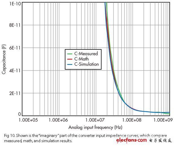 图10: 显示的是转换器输入阻抗曲线的“虚部”部分,它比较了经测量、数学和仿真方法得到的结果。
