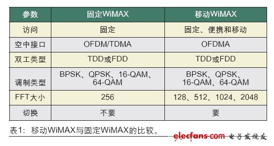 移动WiMAX的信道带宽与固定WiMAX非常相似,而且两者共享调制类型。两者之间的关键区别是移动WiMAX必须能够切换用户连接,并在不同基站和覆盖区域内保持连接。固定WiMAX和移动WiMAX之间的比较见表1。