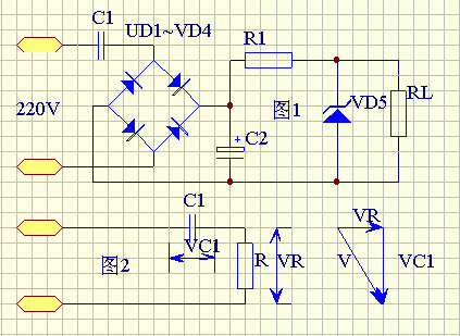 最简单的电容降压直流供电电路及其等效电路如图1,C1为降压电容,一般为0.33~3.3uF。假设C1=2uF,其容抗XCL=1/(2PI*fC1)=1592。由于整流管的导通电阻只有几欧姆,稳压管VS的动态电阻为10欧姆左右,限流电阻R1及负载电阻RL一般为100~200,而滤波电容一般为100uF~1000uF,其容抗非常小,可以忽略。若用R代表除C1以外所有元器件的等效电阻,可以画出图2的交流等效电路。同时满足了XC1>R的条件,所以可以画出电压向量图。